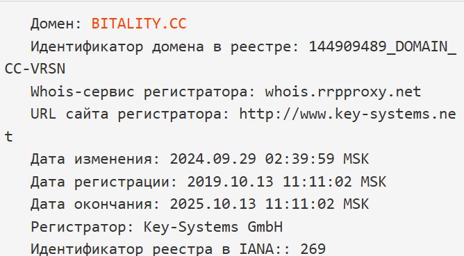 В дизайне сайта Bitality cc прослеживается отсылка на культовую игру Mortal Kombat, что выделяет сервис на фоне конкурентов. Название у обменника BITALITY созвучно с легендарной фразой «Fatality», логотип – символ биткоина, стилизованный под дракона, а в оформлении присутствует известный персонаж Скорпион. Это повышает уровень доверия, ведь обменники-однодневки не слишком заботятся о своем имидже и не уделяют внимание подобным мелочам.Домен bitality cc зарегистрирован в 2019 году. Информация соответствует официальной истории и совпадает с началом отслеживания на мониторингах.