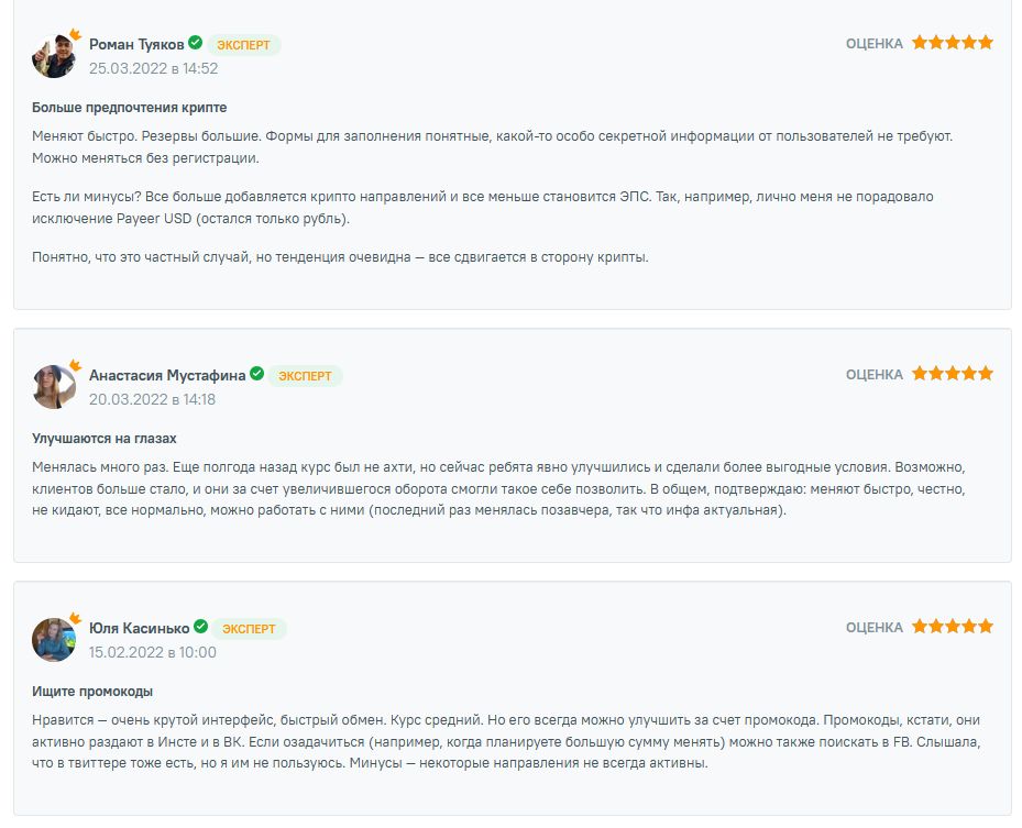 Пользователи отмечают, что обменивают за несколько минут, и хвалят за большой выбор направлений и крупные резервы.