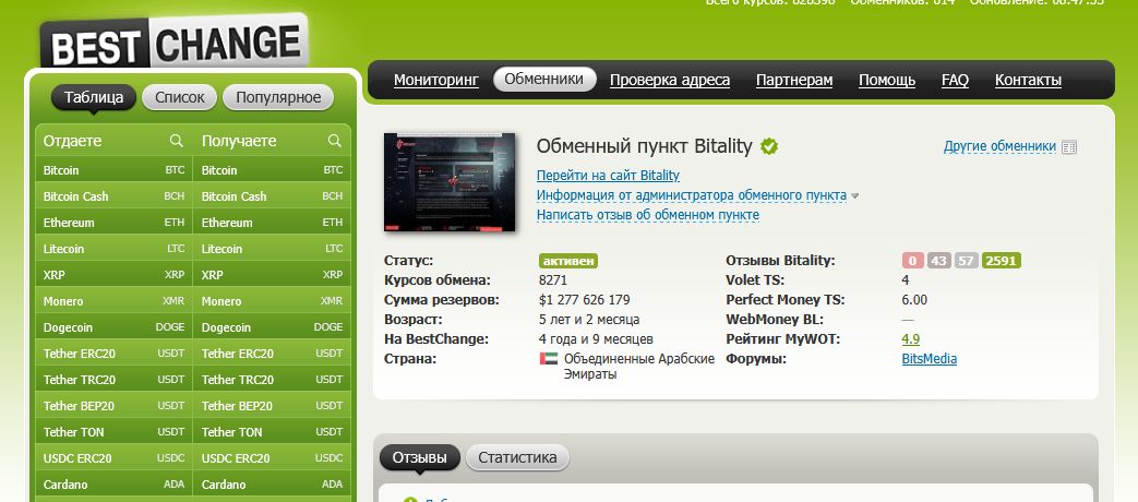 Стоит отметить, что отзывов об обменнике Bitality cc много и большинство из них положительные. На BestChange только 43 закрытых претензий и 2591 положительных отзывов. Рейтинг на MyWOT 4.9 баллов из 5.