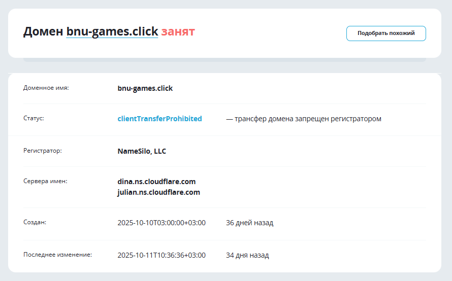 Домен существует на протяжении 36 дней, если отталкиваться от даты подготовки обзора, он был получен в сентябре 2025 года. О владельцах этого адреса нет никаких сведений, их имена не разглашаются, а регистратором выступает малоизвестная компания.
