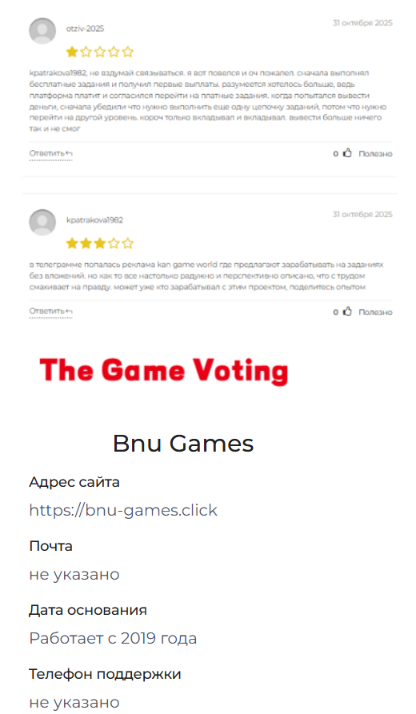 Из-за этого могут возникнуть проблемы с тем, как вывести деньги с BNU Games click, если система предполагает пополнение депозита. В сети мы нашли упоминания о том, что в рамках проекта пользователи могут выполнять задания: просматривать рекламу, переходить по ссылкам и голосовать за игры. За это на баланс начисляется награда, но количество задач ограничивается – за их получение придется платить. Вероятно, на этом и построена схема мошенничества BNU Games, о которой ходят слухи в интернете.