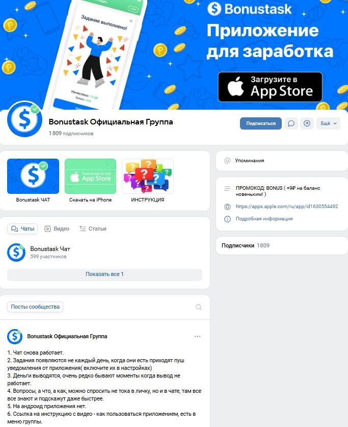 ВКонтакте есть сообщество «Bonustask Официальная Группа» (bonustasks). Она больше похожа на официальный канал. Здесь админы выкладывали инструкции по работе с приложением, проводили розыгрыши призов, отвечали на вопросы подписчиков. Последний пост тут вышел в 2024 году. Сейчас сообщество заброшено.