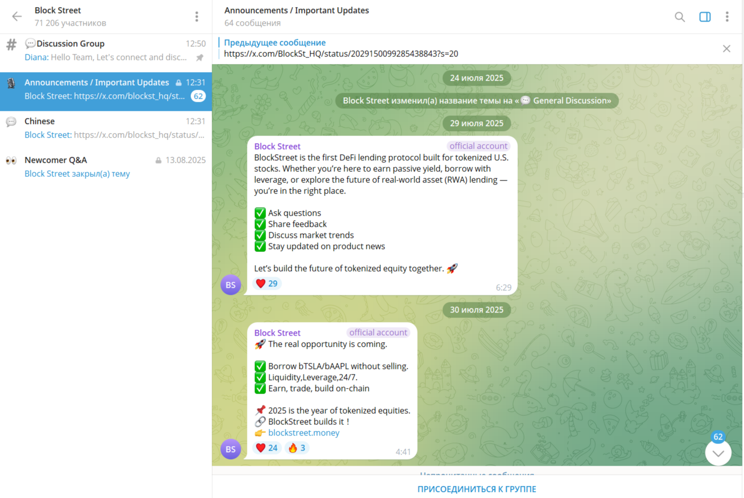 В Телеграмм есть сообщество, посвященное монетке. В апреле 2026 года в нем состоят 71 206 человек. Контент выходит на английском языке, что затрудняет его изучение.