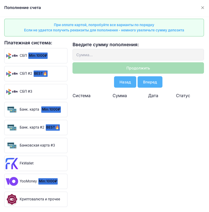 Внесение депозита доступно множеством разных способов. Среди них присутствуют: СБП, банковские карты, ЭПС и криптовалюты. Для некоторых видов платежей предусмотрены минимальные суммы – в районе 1 тысячи рублей.