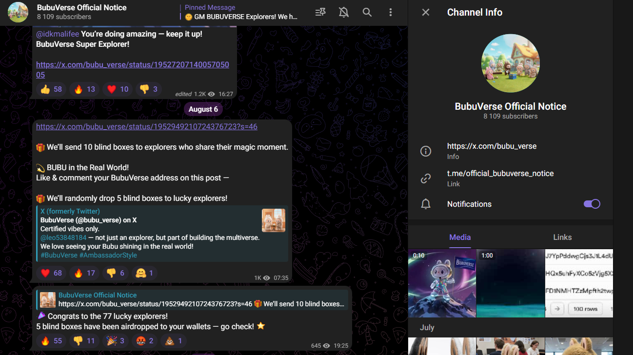 - Телеграмм канал official bubuverse notice — аудитория 8000 человек, публикуют новости Метавселенной, в основном репосты из X. Сообщество создано 30 июля 2025 года, контент читает менее 1000 человек.