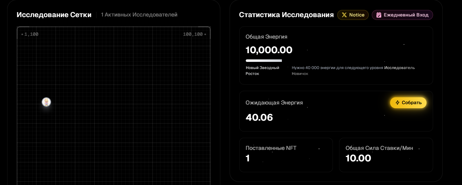 Полученного Лабубу нужно отправить в исследование пространства. Мультипликатор х10 говорит о том, что в минуту будет добываться 10 энергии, а общее ее количество составит 10 000 единиц. Для повышения уровня пространства нужно собрать 40 тысяч энергии.