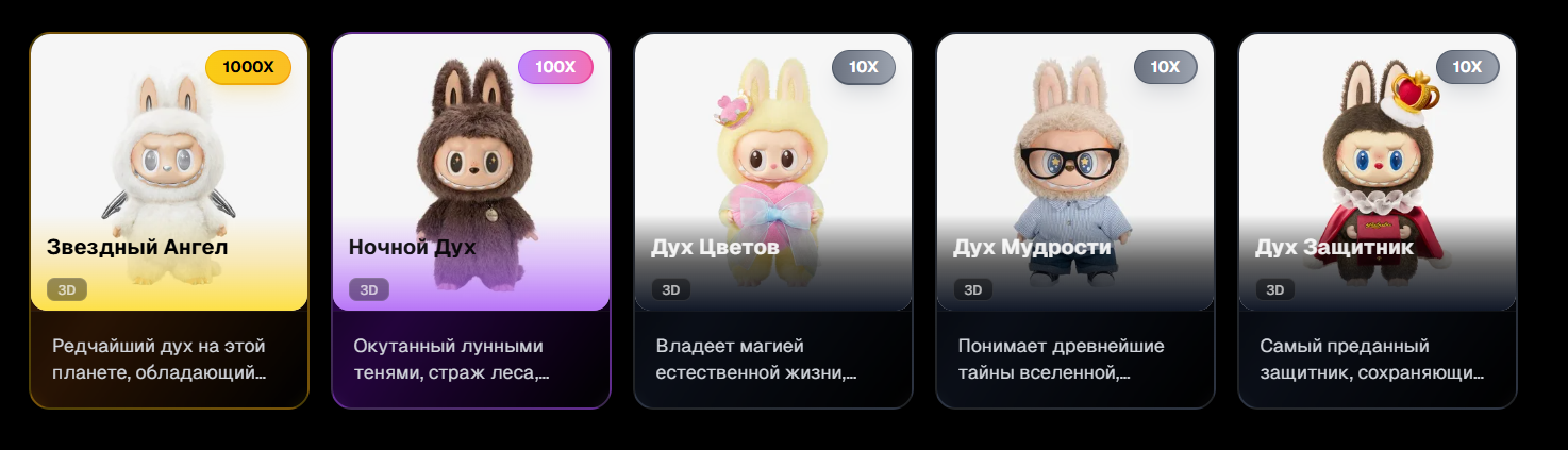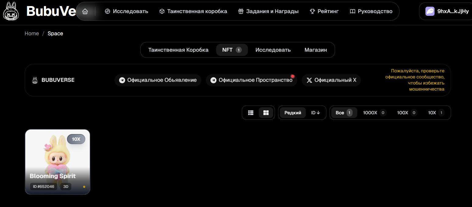 Функционал BubuVerse довольно прост и напоминает обычные Телеграмм приложения. Первым делом пользователь открывает подарочную коробку и получает свой первый невзаимозаменяемый токен. Далее нужно перемещаться по вкладкам и выполнять задания, собирать бонусы, исследовать пространство и добывать монеты. Стоимость добычи зависит от количества и качества NFT, всего их три вида: х10, х100 и х1000. Получить мультипликатор 100 или 1000 с подарочного бокса — большая удача.