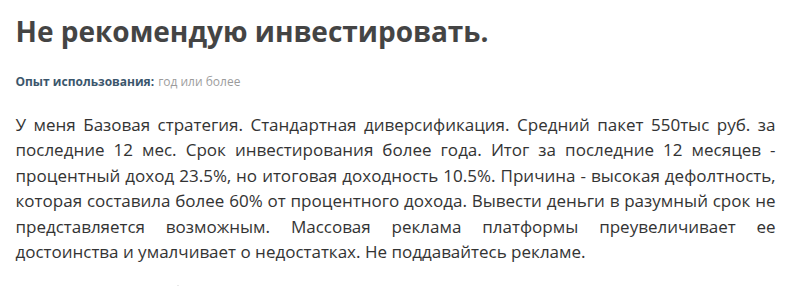 Однако куда больше отзывов от тех, кто проработал с платформой хотя бы год. Опыт таких юзеров гораздо печальней, и в основном жалобы связаны с массовыми дефолтами. Инвесторы рассказывают, что на старте портфель и правда показывает неплохую доходность, но через 6-12 месяцев начинается волна банкротств. Компании, которые еще вчера исправно платили, уходят в просрочку, и вернуть из них деньги Potok Digital Investor уже не может. В итоге вся накопленная прибыль сгорает, а вкладчикам остается с убытком.