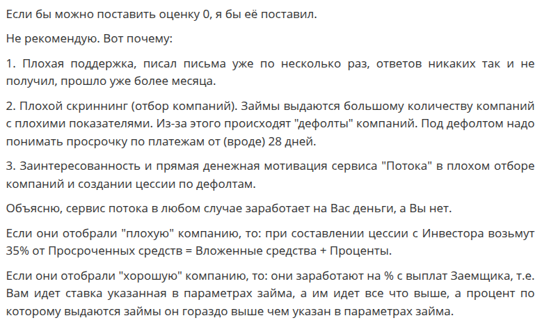 Главная проблема в том, что «Поток Диджитал Инвест» зарабатывает на комиссии с каждого выданного займа. Ей выгодно, чтобы кредитный конвейер работал без остановок. Вернет заемщик деньги или нет – это уже головная боль инвестора. В случае дефолта сервис, конечно, имитирует бурную деятельность по взысканию долга, но на практике вернуть мало что удается.