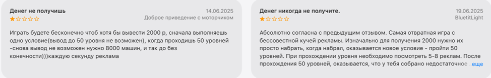 По отзывам, «Кар Матч Мастер» – игра, с которой не получится заработать. Пользователи отмечают, что встречается много рекламы, а достичь уровня, позволяющего вывести средства, невозможно. Администрация приложения постоянно придумывает поводы, чтобы не перечислять заработанные деньги игрокам.