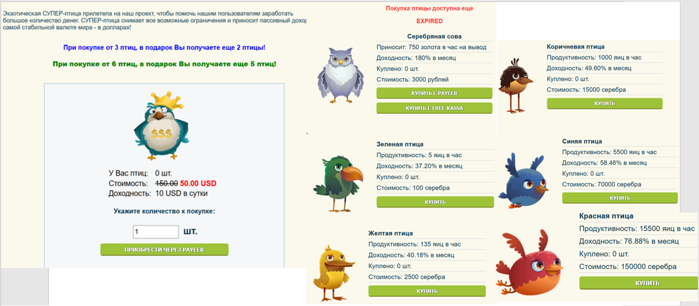 - Экзотическая SUPER‑птица: $50, приносит $10 в сутки; при покупке 3-х, получаете 2 в подарок; купите 6 штук и дадут еще 5.