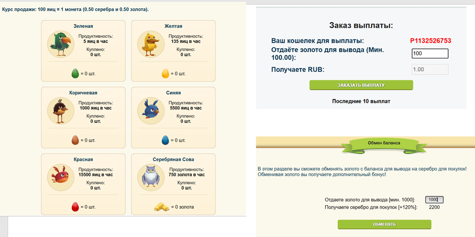 - Зеленая птичка: 100 серебра, 5 яиц/ч, 37,2 % в месяц.