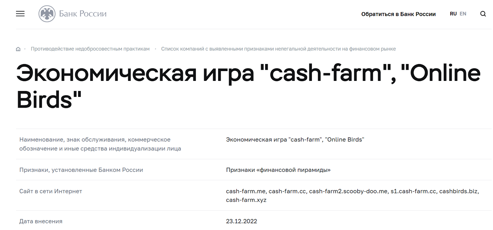 Среди очевидных признаков, вызывающих настороженность, тревожный официальный статус проекта. Так, 23 декабря 2022 г. ЦБ РФ внес Cash Farm (включая домены cash-farm.me, .cc, .xyz и т.д.) в список компаний с признаками финансовой пирамиды.