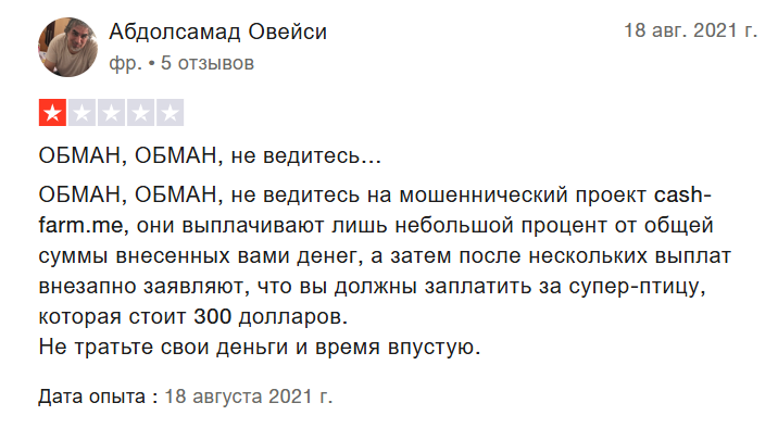 Свежих независимых откликов об игре немного, но даже те, что нашлись, рисуют однозначную картину. Пользователи пишут о том, что cash farm скам, а на Trustpilot проект держит 2,6 балла. Все четыре отклика с одинаковым мотивом — платят копейки, без доплат игра не дает и шагу сделать.