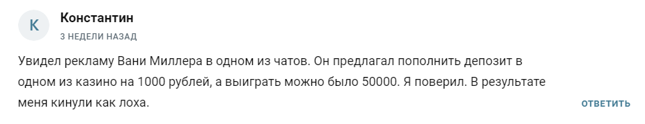 Другой подписчик по имени Константин написал в отзыве, что потерял 1 тыс. руб., поверив сказкам Миллера о джекпоте.