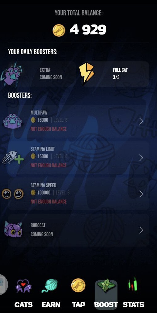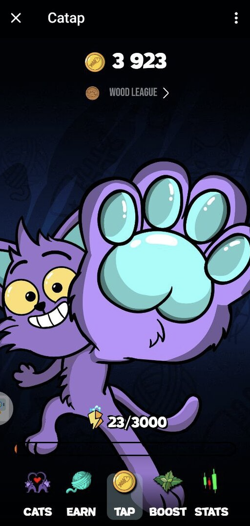 Чтобы зарабатывать в ней монетки, требовалось кликать на изображение вытянутой лапы кота. Тапать можно было до той поры, пока на счете энергии имелись поинты. Затем требовалось подождать момента, когда очки восстановятся.