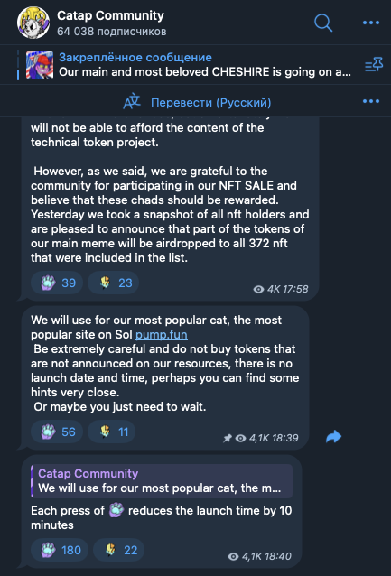 На телеграмм-канал Catap Community, catapcommunity, на 20 декабря 2024-го года, подписано около 64 тысяч пользователей. Последние публикации, которые датированы началом ноября, были просмотрены около 4-5 тысяч раз.