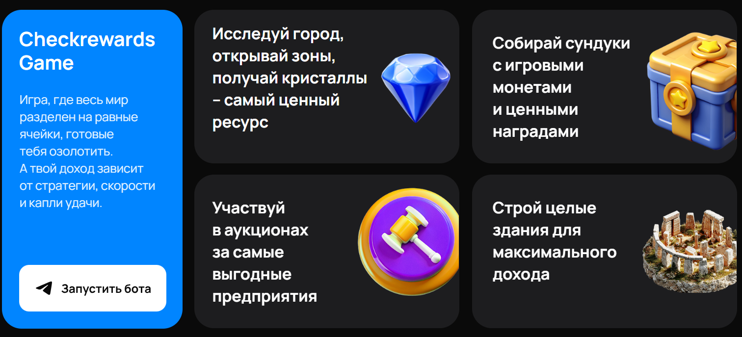 Суть игры заключается в том, что пользователь CheckRewards bot выполняет специальные задания, прокачивает своего персонажа и улучшает город, открывая на карте новые предприятия. Самый ценный ресурс – это кристаллы. Также можно собирать сундуки с игровыми монетками и ценными наградами.