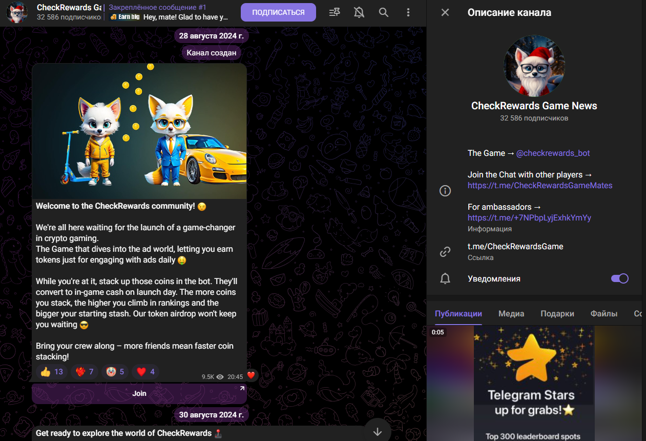 У игры есть публичный телеграмм-канал CheckRewards Game News, который был зарегистрирован 28 августа 2024 года. Посты публикуются на английском. К каналу в Telegram на январь 2026 года присоединилось 32 500 человек. Охваты постов игры «Чек Ревардс гейм» при этом куда ниже, что указывает на высокую вероятность накрутки аудитории.