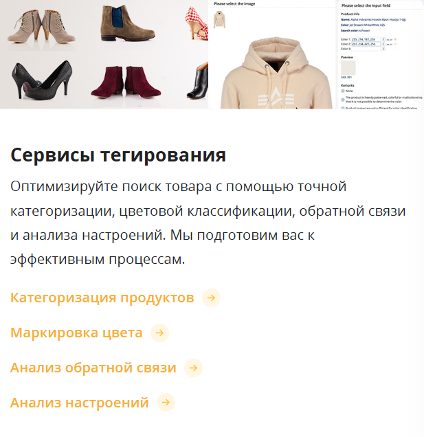 Помимо заработка на простых заданиях ClickWorker de предлагает и готовые решения для бизнеса. Например, сервисы так называемого тегирования помогают якобы оптимизировать поиск товара в своем интернет-магазины с помощью: