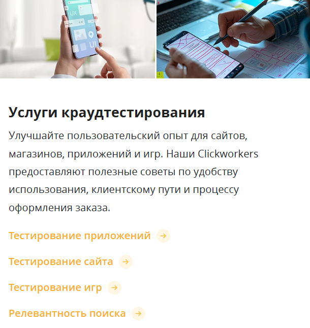 Услуги краудтестирования помогают улучшить пользовательский опыт для сайтов, магазинов, приложений и игр. Click Worker предлагает якобы полезные советы по удобству использования, клиентскому пути и процессу оформления заказа.