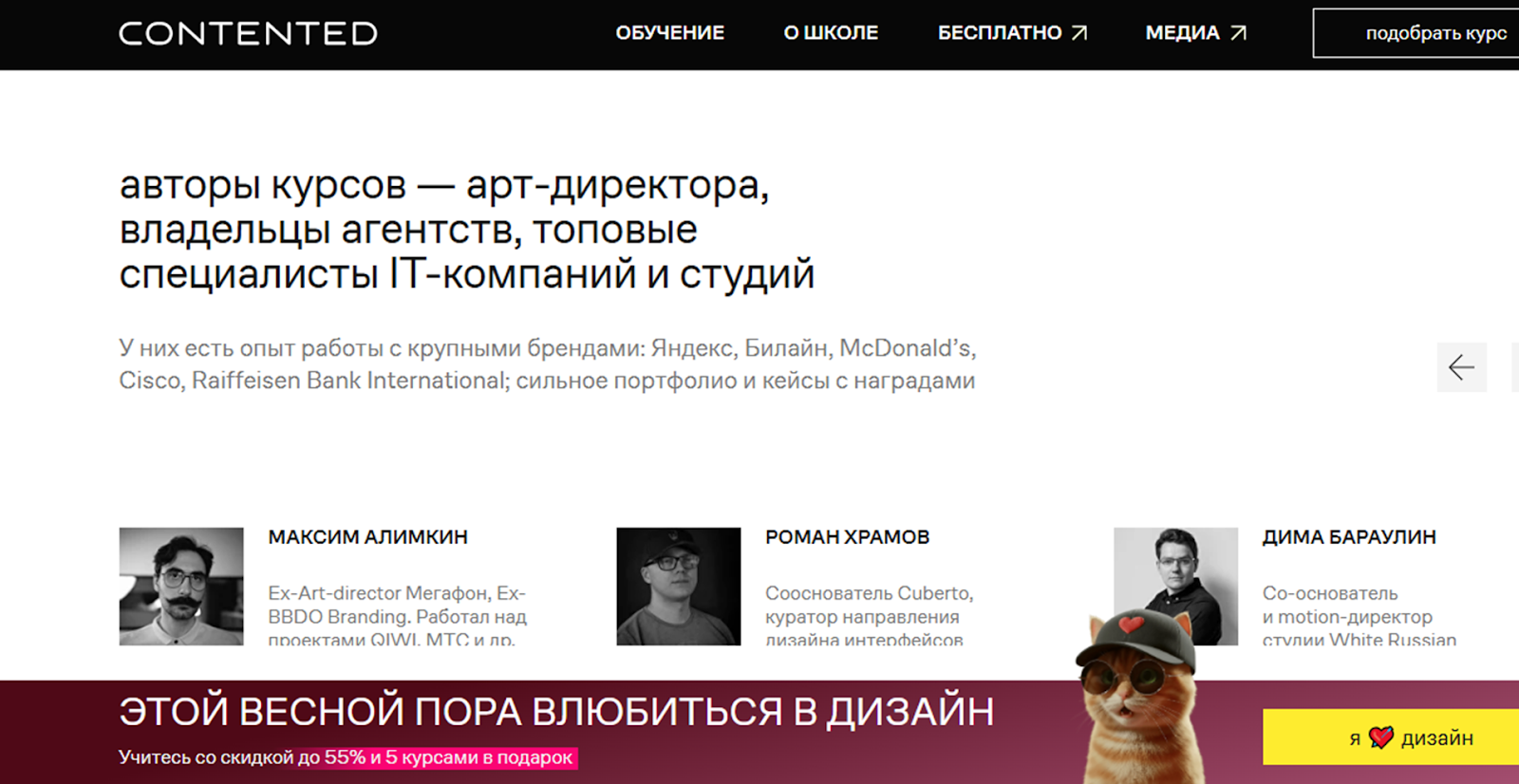 Школа Contented Education сотрудничает с такими знаковыми проектами и площадками как Ozon, Artman, Redkeds, Авито, Ростелеком, СБЕР и другими. Здесь ученики могут проходить стажировку, на сайте школы есть возможность ознакомиться с их работами.