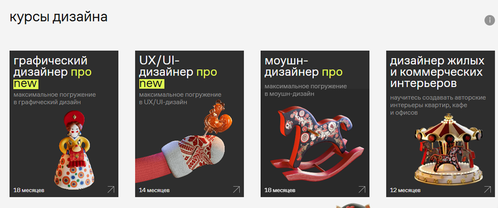Перечень курсов Contented довольно впечатляющий. Платформа предлагает порядка 14 образовательных направлений из разных областей дизайна.