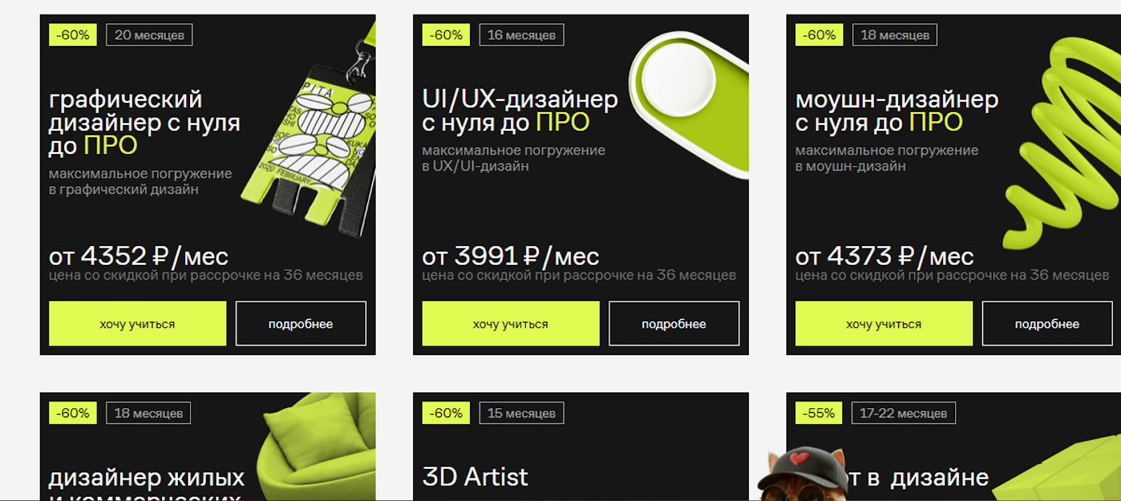Здесь можно найти традиционные курсы по дизайну интерьера и графическому дизайну. Курсы по освоению нейросетей и созданию контента. А также более редкие направления – UX/UI дизайн, курс по дизайн-системам или управлению компьютерными играми. На данный момент в рунете очень мало онлайн-школ, которые могут похвастаться таким количеством образовательных направлений в данной области.Но важно понимать, что предложена довольно высокая стоимость обучения в Contented, правда есть возможность оформить рассрочку от банков-партнеров. В среднем, цена за базовый курс варьируется от 4000 до 6000 рублей при условии оплаты в рассрочку на 36 месяцев. При единовременной оплате всей суммы могут быть предоставлены скидки и бонусы – зависит от выбранного курса и действующий акционных предложений.