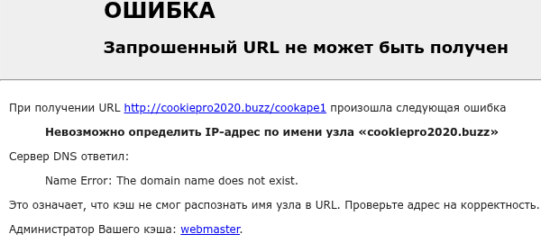 «При получении URL произошла следующая ошибка. Невозможно определить IP-адрес по имени узла cookiepro2020.buzz Сервер DNS ответил. Name Error: The domain name does not exist. Это означает, что кэш не смог распознать имя узла в URL. Проверьте адрес на корректность». Как мы поняли по детальному исследованию, подобное происходит далеко не в первый раз. Ранее сервис Cookie Pro был известен под следующими адресами: