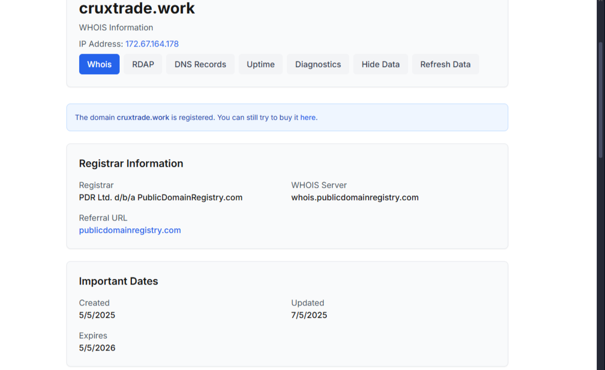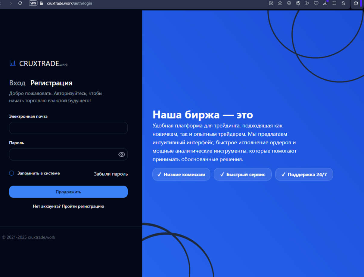 По информации сервиса Whois, домен проекта «Крукстрейд» зарегистрирован летом 2025 года, хотя на самой платформе заявляют, что работают с 2021. Сервис позиционируется как глобальная площадка для инвестиций и торговли криптой. Cruxtrade поддерживает локализацию на несколько языков, а для регистрации требует специальный инвайт-код. Такая система ограничивает доступ и создаёт ощущение «закрытости», хотя на деле просто мешает быстро проверить условия работы.