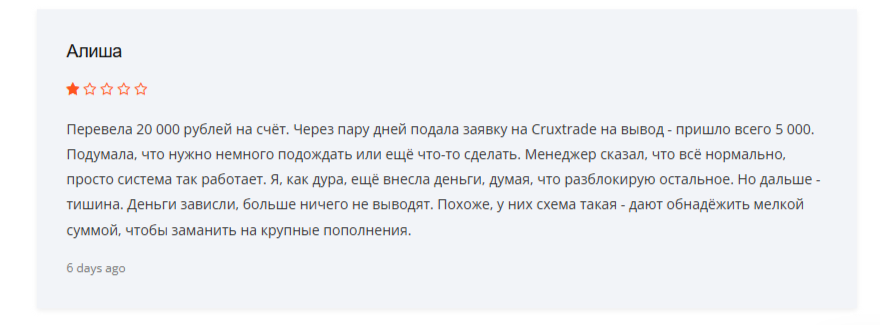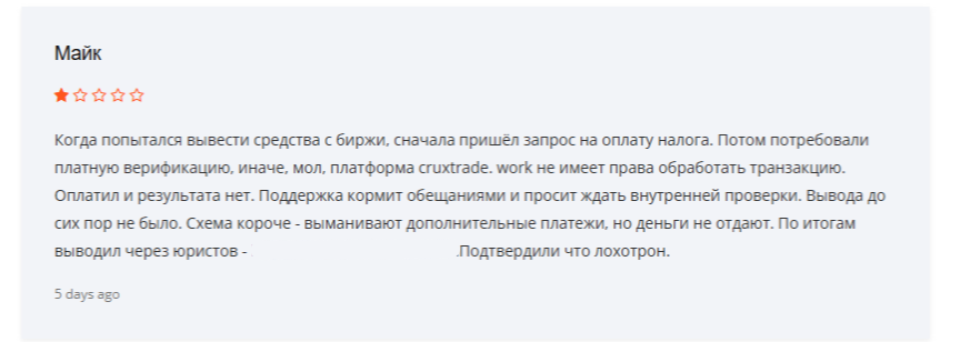 В интернете и на популярных форумах нечасто упоминают эту биржу. На некоторых сайтах встречаются отзывы о невозможности вывести деньги из Cruxtrade. Пользователи рассказывают, что после попытки вывода с них требуют оплатить комиссии, налоги или пройти платную верификацию.