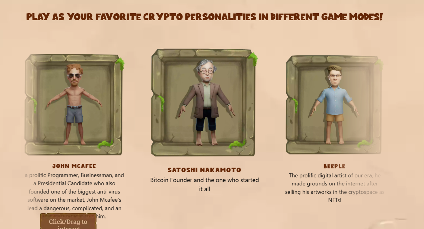 Для начала необходимо перейти на сайт проекта и загрузить приложение. Действия игры происходят на определенном участке остова, в котором нужно выполнять предложенные задания. Первым делом игрок Crypto Islands P3e должен выбрать персонажа. Здесь персонажами выступают известные личности в мире криптовалют такие, как: основатель БТС Сатоши Накамото, энтузиаст WarCraft Виталик и прочие.