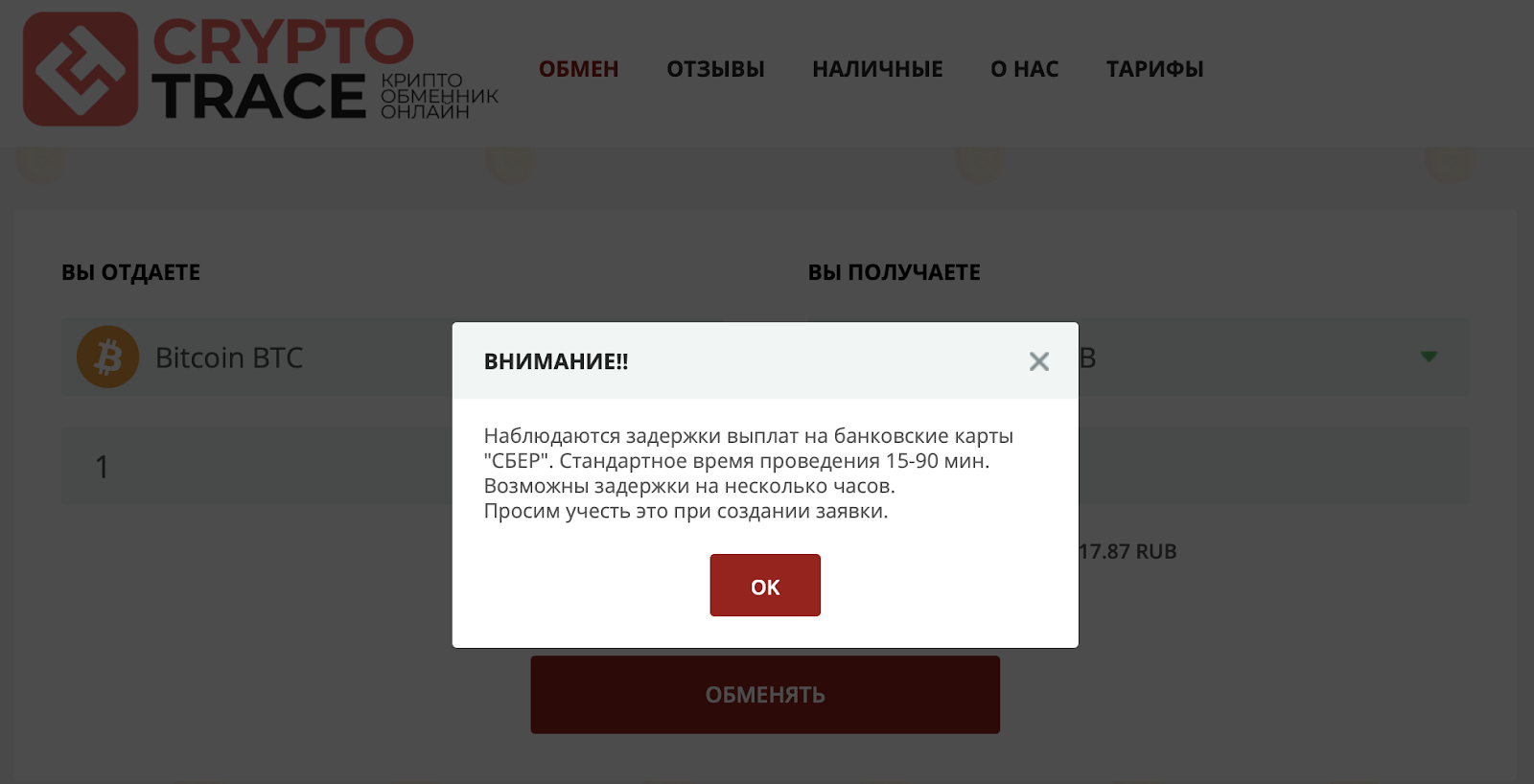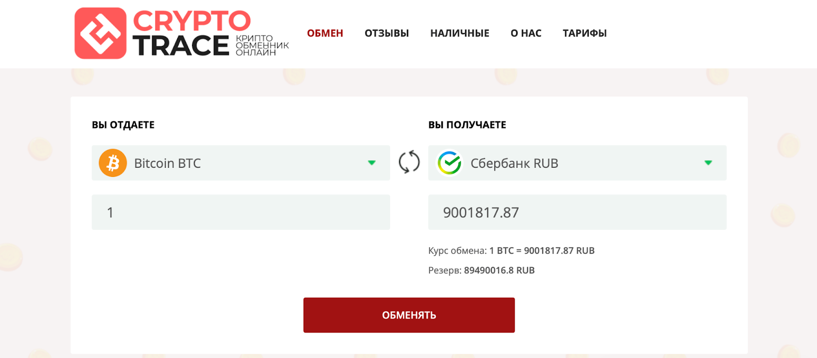 Сегодня мы подробно изучим сайт подозрительного сервиса crypto trace com, гарантирующего «мгновенный и выгодный» обмен криптовалюты. Создатели заявляют о безукоризненной работе сайте, прозрачных условиях обмена и прочих шаблонных преимуществах сервиса. В золотые горы мы не верим и будем оценивать обменник по всем ключевым критериям.