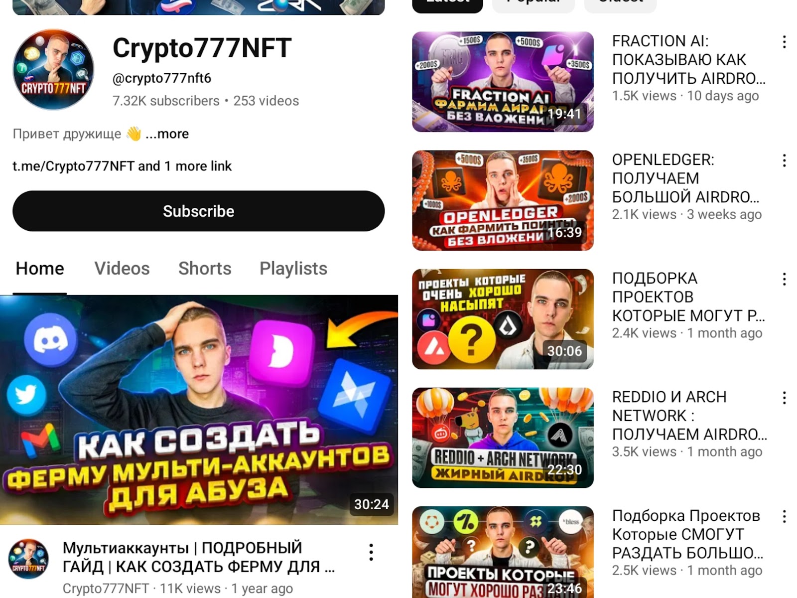 За это время блогер разместил 253 видео. Их просмотры составляют 1-3k. В видеороликах создатель рассказывает о том, как получить аирдропы от проектов. Еще предоставляет подборки лучших, по его мнению, проектов с раздачей монет. Есть видео, посвященные заработку без вложений. Длительность видеороликов до 20 мин. Автор канала размещает контент 2-3 раза в месяц. Ссылки на прочие соцсети автор канала не публикует.