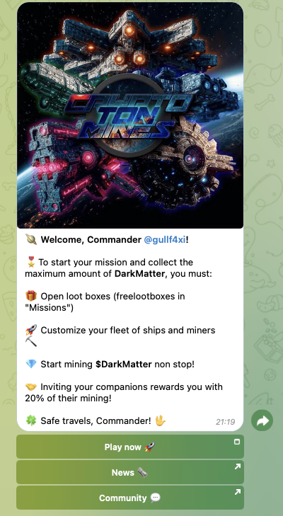 После его активации в чат поступит приветственное сообщение. Под ним будет присутствовать набор ссылок. Чтобы попасть в игру, нужно кликнуть по кнопке Play now. В результате во встроенном в Telegram браузере загрузится мини-приложение.