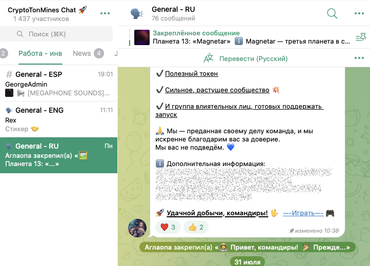 В сообществе CryptoTonMines Chat состоит около 1,44 тысяч участников. Сообщения в ленты этого чата может отправлять только админ.