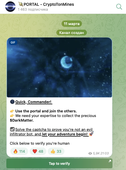 Также у проекта есть официальный телеграм-чат. Чтобы в него попасть, сначала нужно пройти верификацию. Сделать этом можно через аккаунт Portal CryptoTonMines, который находится по адресу CryptoTonMinesPORTAL.