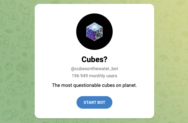Чтобы запустить игру «Кубес», сначала нужно зайти в telegram-bot cubesonthewater – Cubes On The Water Bot. После того, как он будет активирован, в чат поступит набор ссылок.