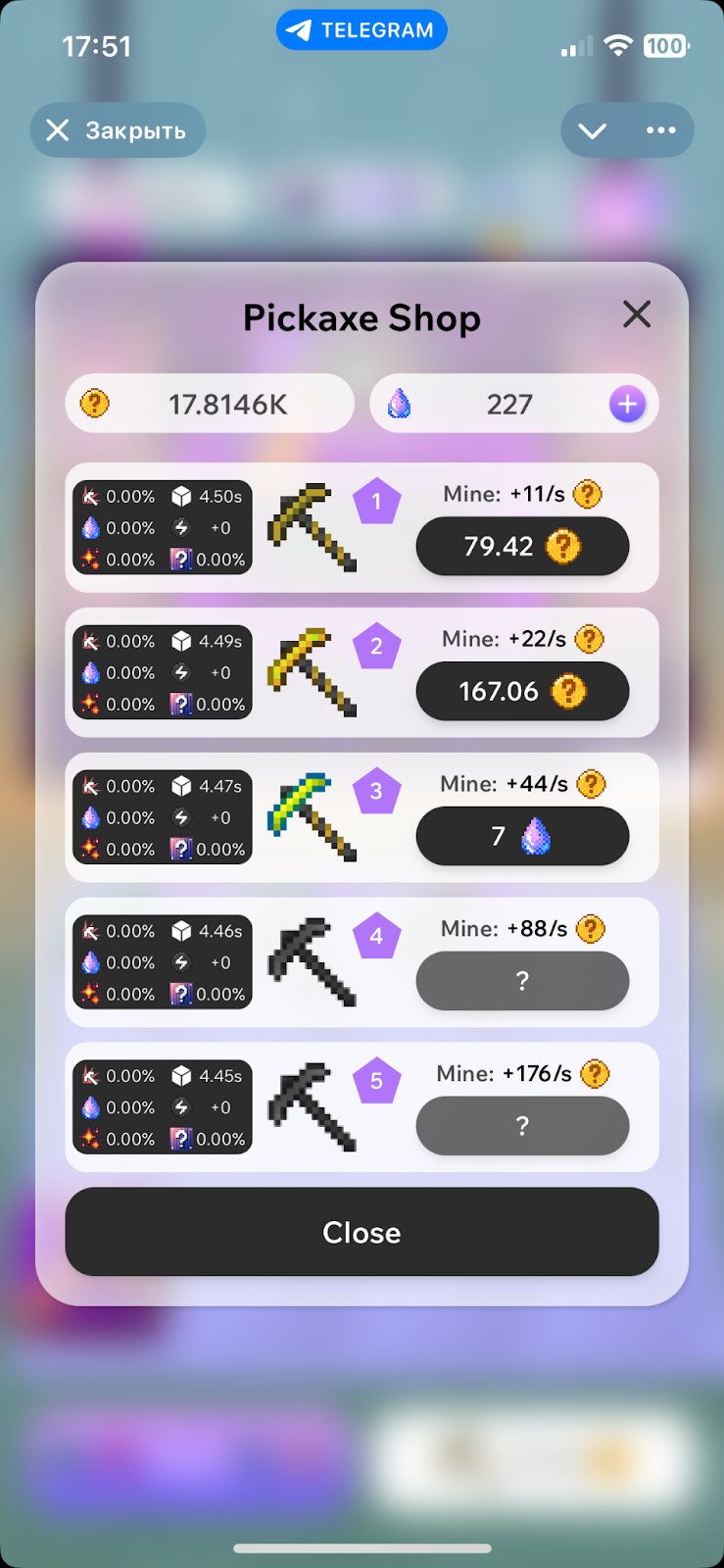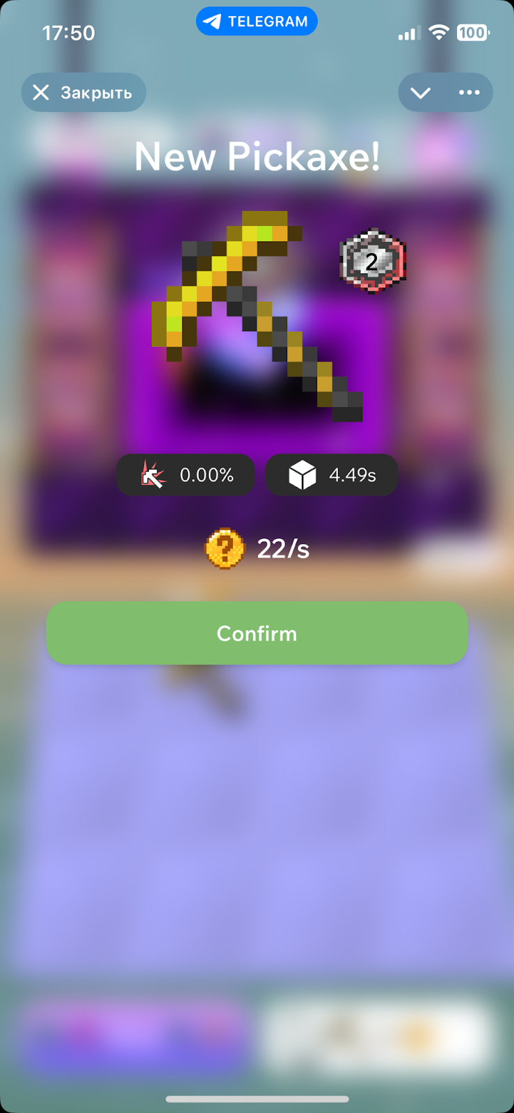 В результате этих действий будут создаваться новые айтемы, которые имеют более высокие характеристики. Также у каждой кирки есть свой показатель добычи. Например, кирка второго уровня добывает 22 монеты в секунду, а четвертого – 88.