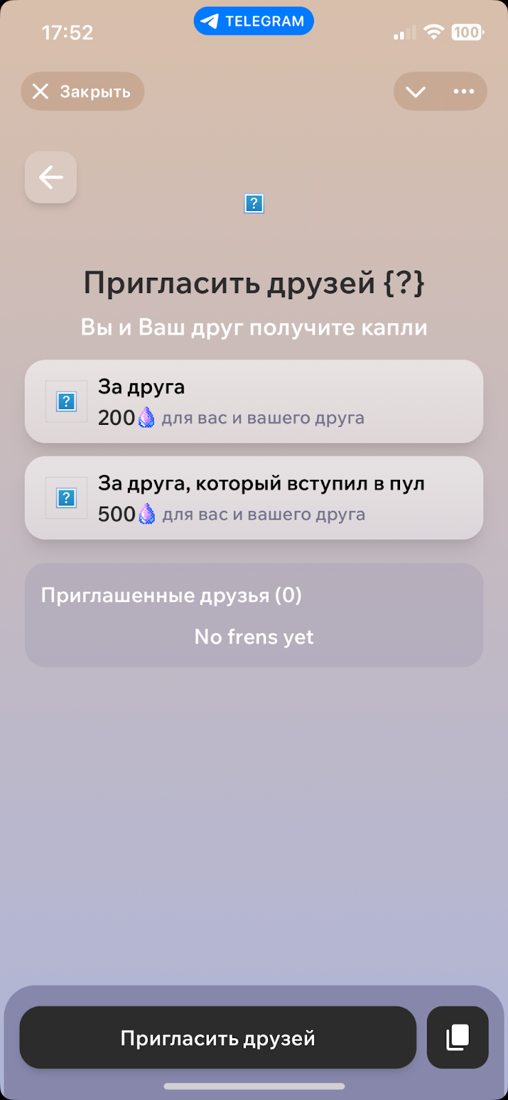 Также кристаллы возможно заработать за приглашение в проект новых участников. Ссылка для привлечения рефералов находится во вкладке «Друзья».За обычного пользователя, который принял заявку, предоставляют 200 кристаллов. Если у юзера подключен Telegram Premium, награду за него увеличивают до 500 гемсов.