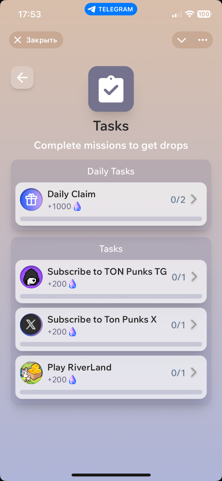 Также получить доход возможно за счет выполнения заданий от разработчиков. Их список находится в разделе Tasks. Например, за вступление в сообщество Punks моментально дают 200 гемсов.