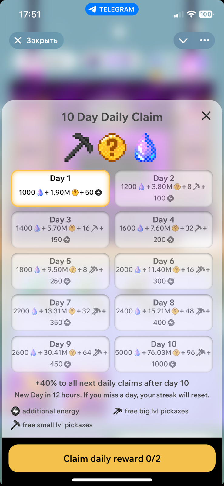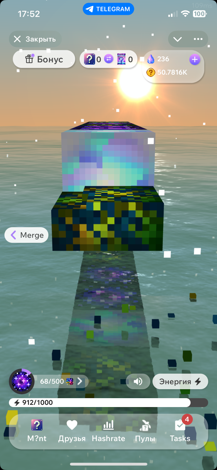 Задача пользователя – разбивать появляющиеся на дисплее блоки. Тапать можно до той поры, пока есть доступные очки энергии – их баланс отображается в нижней части дисплея.