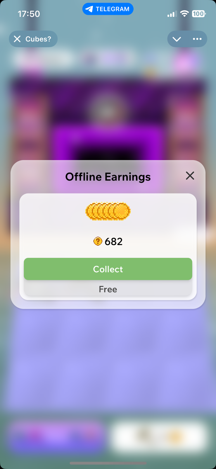 При входе в приложении появляется окно, в котором предлагают забрать накопившиеся во время отсутствия игрока монеты. Чтобы их заклеймить, нужно кликнуть по кнопке Collect.