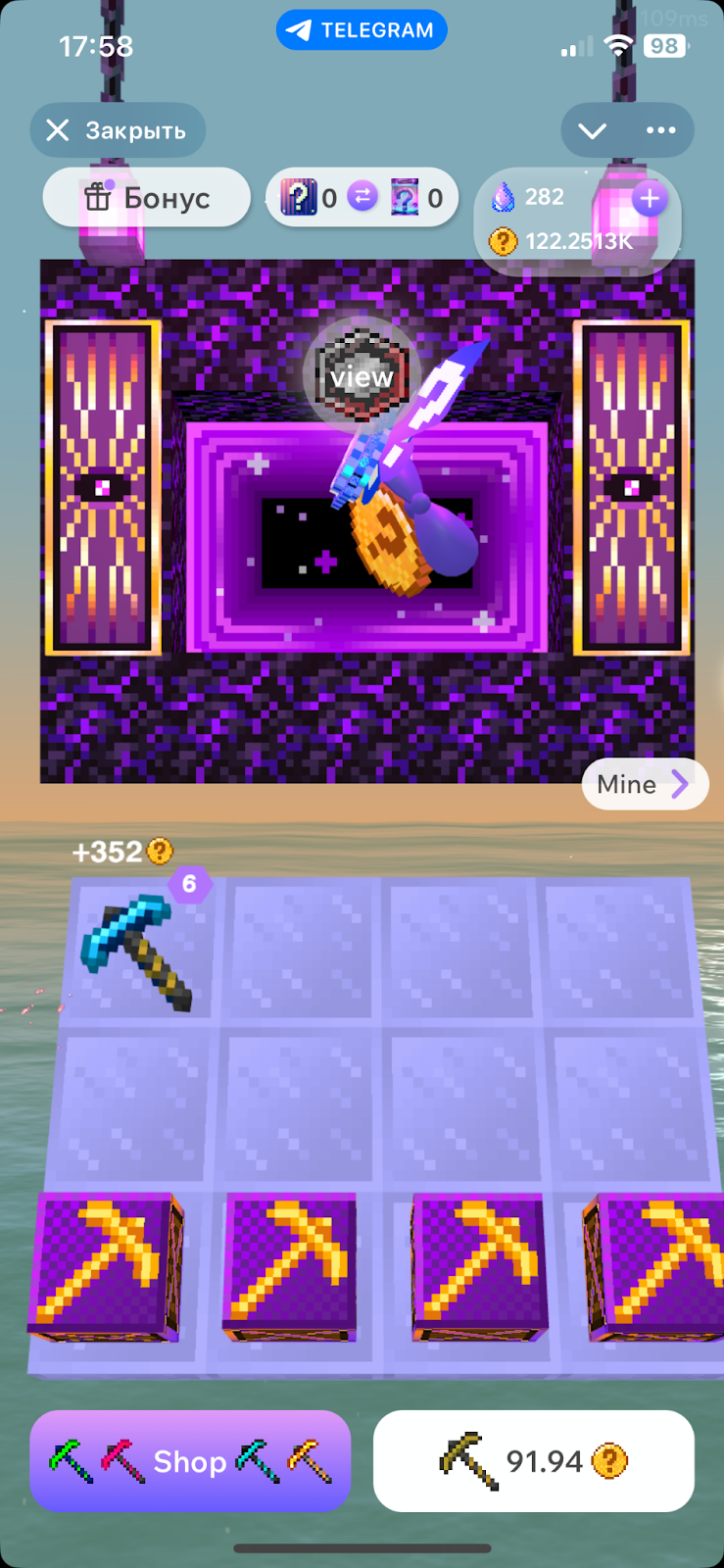 Другой способ добывать ресурсы – зарабатывать их в тапалке. Чтобы перейти на экран кликера, нужно нажать на кнопку Mine, которая находится в правой части экрана.