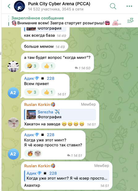 В telegram-боте Cubes есть ссылка на основной аккаунт проекта – чат Punk City Cyber Arena PCCA. В нем, на 19 октября 2024-го года, состоит около 14,5 тысяч участников.