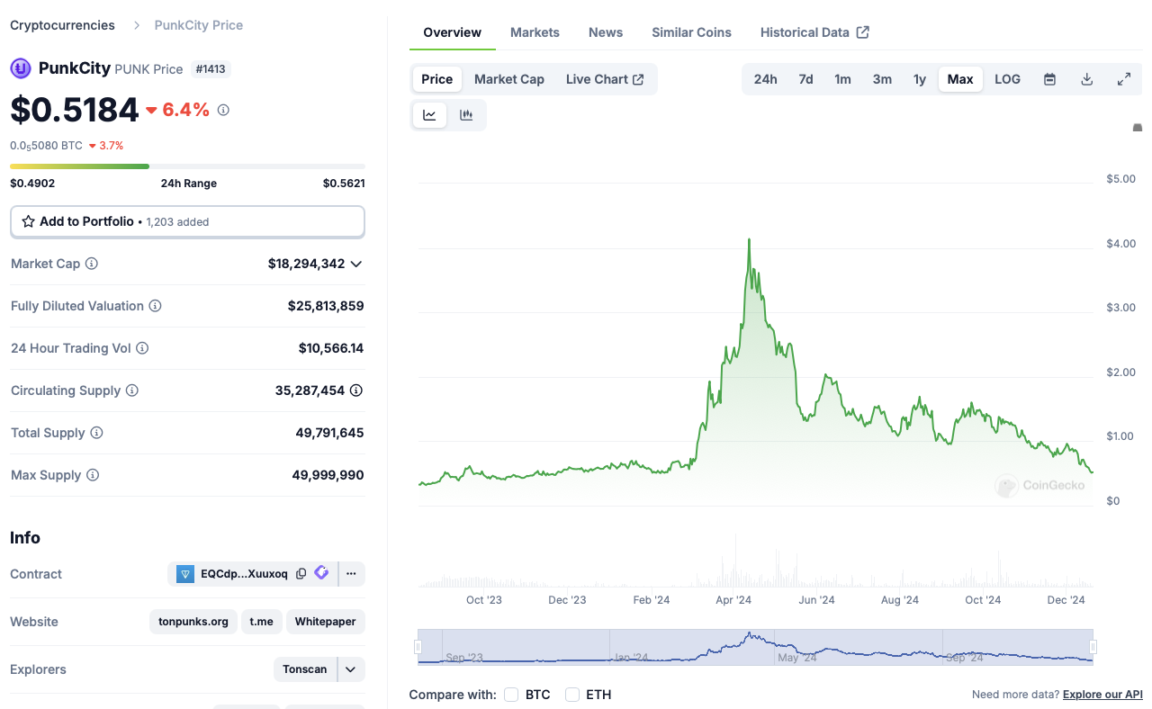 На криптовалютных биржах уже есть токен основного проекта команды основателей – PunkCity. Он находится в листинге более года. Его стоимость, на 19 декабря 2024-го, составляет 52 цента за штуку.