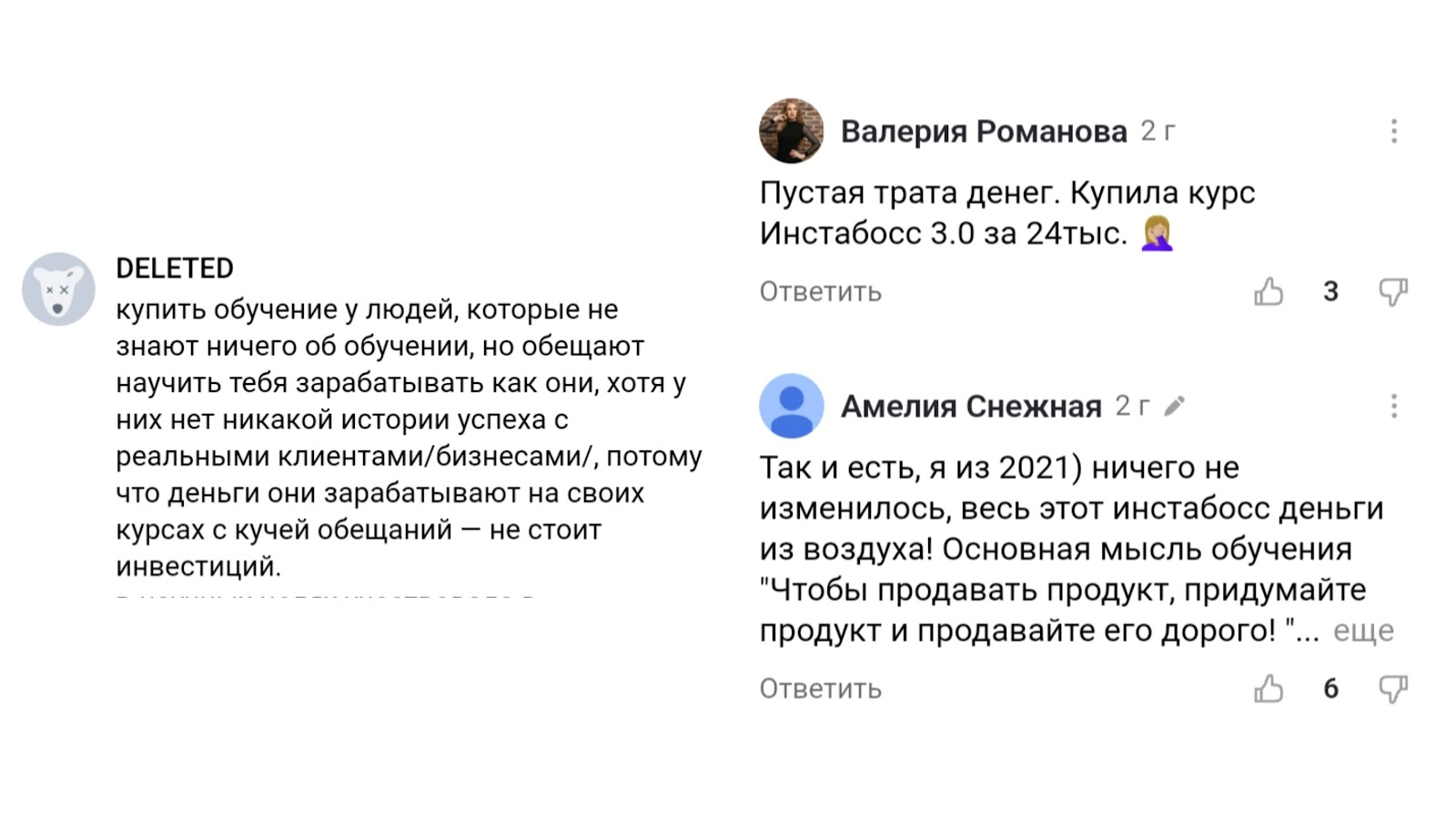 Курсы Марго Савчук и Данила Матухно вызывают серьезные сомнения. Несмотря на закрытие Instaboss, они продолжают зарабатывать на неопытных блогерах. Учебные материалы часто оказываются простыми пересказами из интернета. Доверять таким инфоцыганам не стоит — инвестиции в их обучение, судя по отзывам, не принесут ожидаемой прибыли.