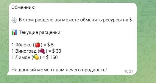 - Обменник позволяет обменивать собранные плоды и ресурсы на внутриигровую валюту — баксы.