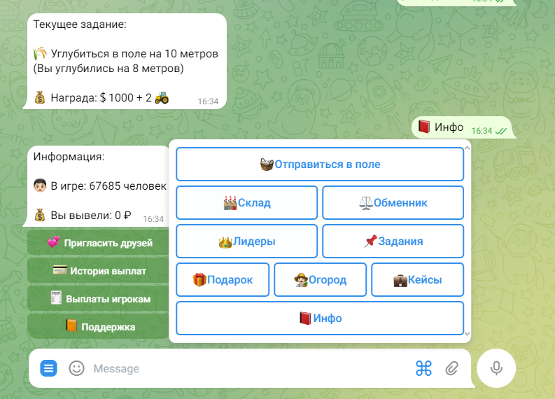 Изначально игра Денежный Фермер в Телеграме привлекает пользователей бесплатным участием, где предлагается собирать плоды и продавать их за виртуальные деньги, которые якобы можно обменять на реальные средства.