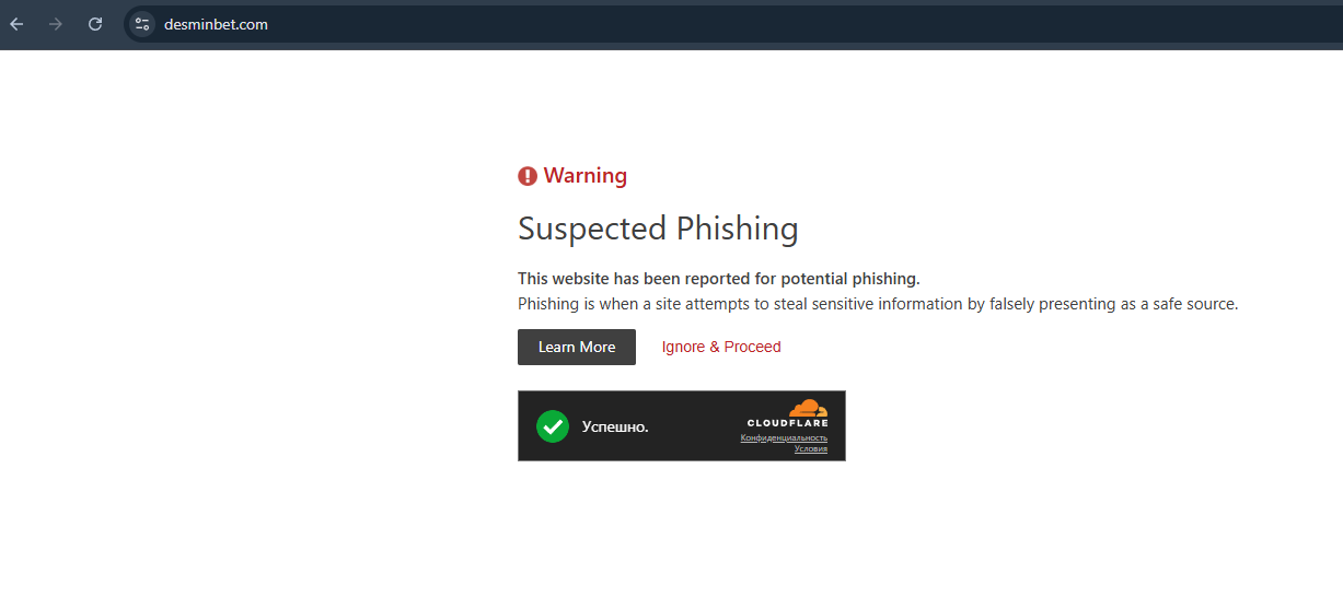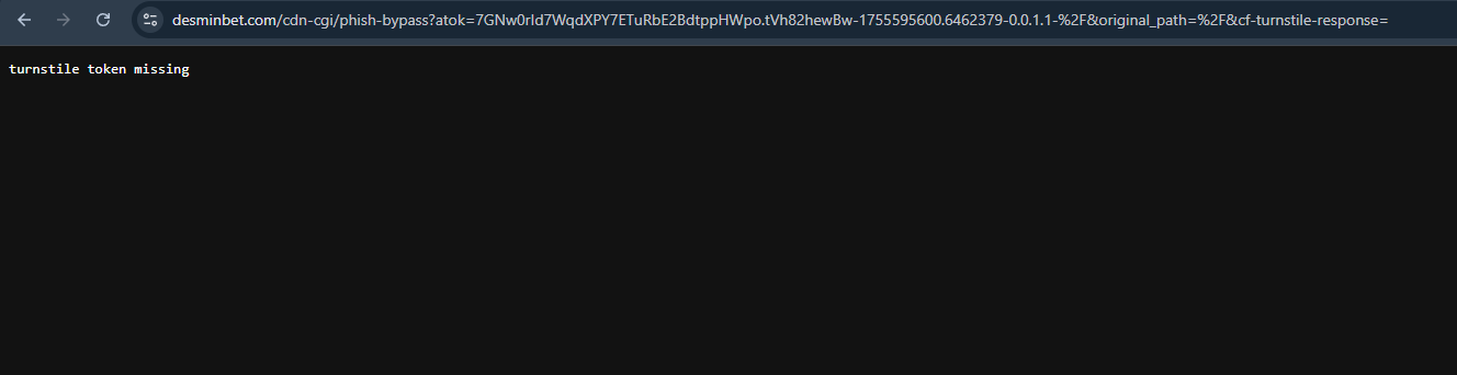 Если проигнорировать предупреждение и перейти на сайт Desminbet com, на экране появится сообщение turnstile token missing. Ошибка означает, что токен безопасности не был предоставлен, истек или подделан.
